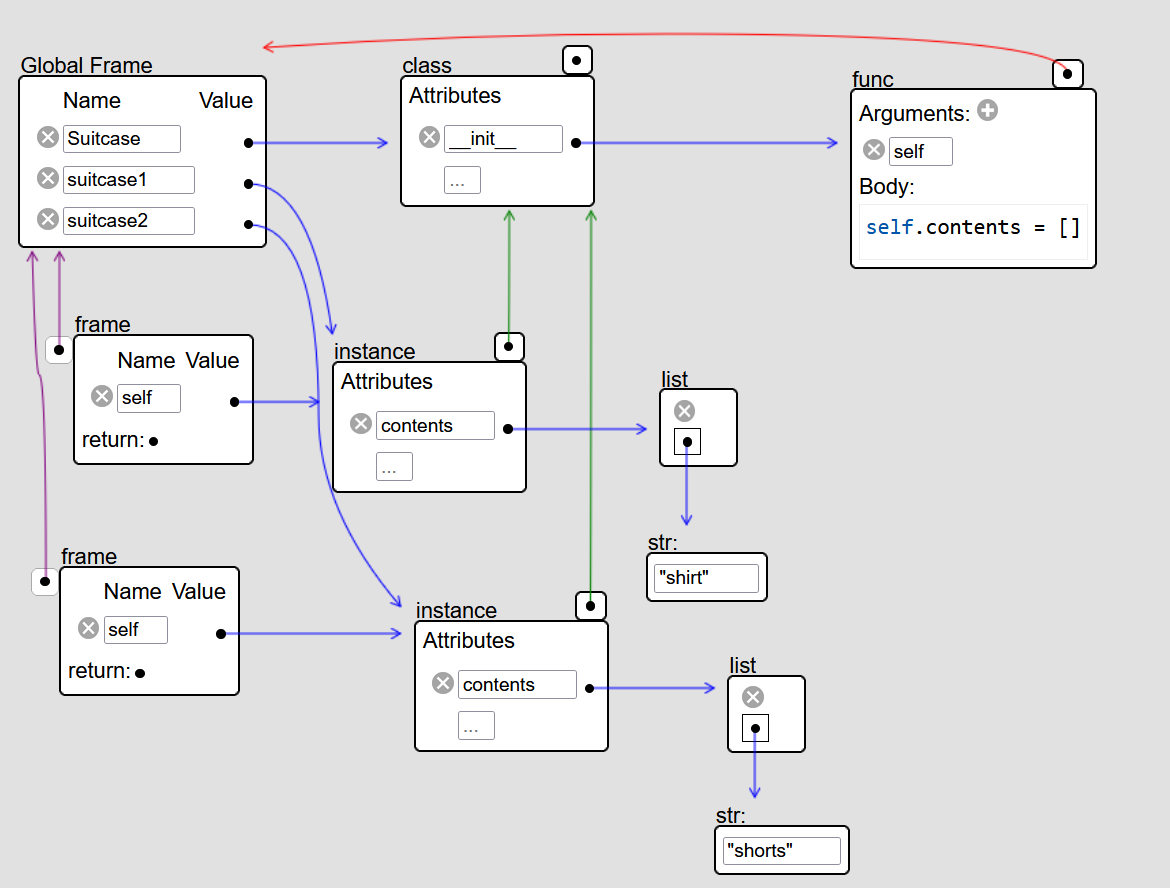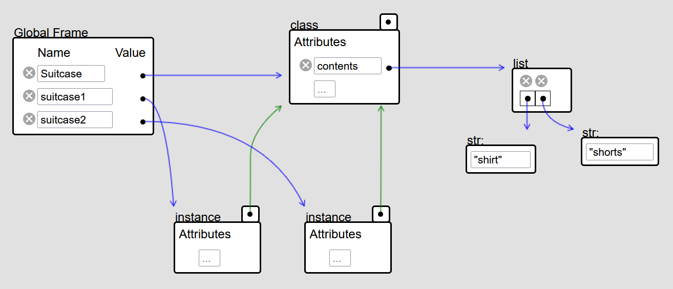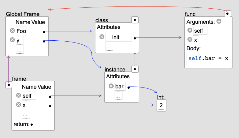 - There should be the global frame and three other objects: a class with 2 attributes, an int, and a function.