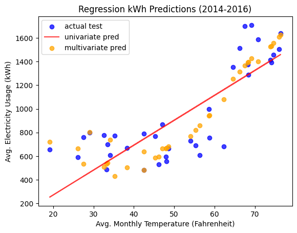 For the most part, these results match what we would expect. The amount of electricity used increases with the average temperature, and the usage this month predicts for a very cold month (average of 30 degrees) is around the levels we see during the cold winter months in the real data.